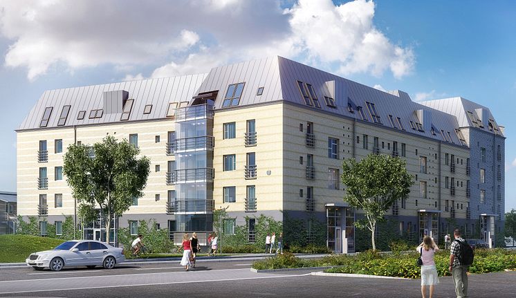HSB brf Gråsejens andra etapp, huset sett från korsningen Limhamnsvägen/Kalkbrottsgatan.