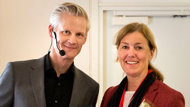 HSB Malmös HR-chef Malin Sandvig med prisutdelaren Henrik Fexeus.