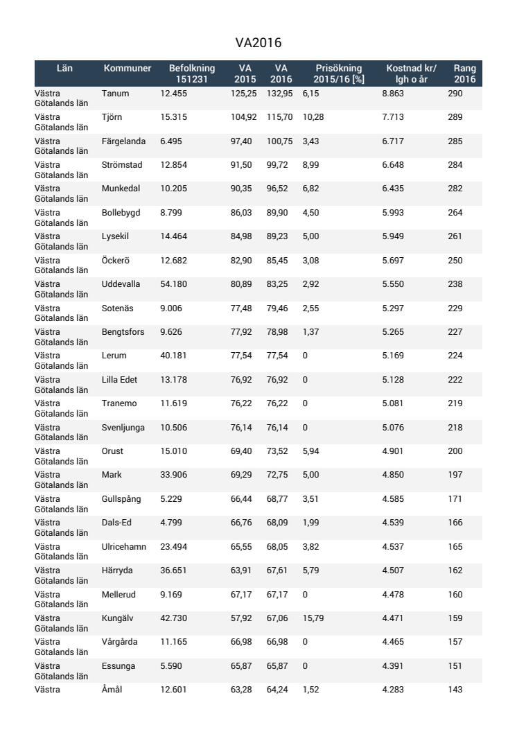 För fjärde året i rad ökar avgifterna för VA . Priset för vatten och avlopp skiljer sig kraftigt mellan landets kommuner. Dyraste kommunen i Västra Götalands län är Tanum, Lidköping är billigast medan Kungälv har haft den kraftigaste prisökningen på 15,8 procent. Det visar Nils Holgersson-gruppens senaste rapport, där prisskillnaderna för vatten och avlopp jämförs mellan kommunerna.