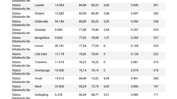 I tabellen rangordnas kommunerna i Västra Götalands län utifrån VA-taxa på årsbasis för 2016. VA-taxan redovisas enligt en typlägenhet om 67 kvm. Alla uppgifter är inkl moms.
