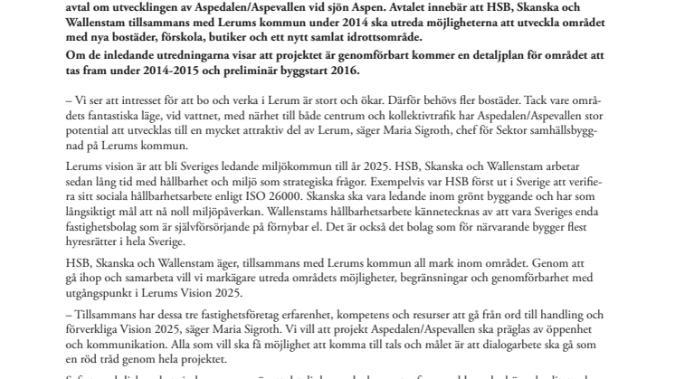 Idag, den 18 december, fattade kommunstyrelsen i Lerum beslut om att godkänna upprättat samarbetsavtal om utvecklingen av Aspedalen/Aspevallen vid sjön Aspen. Avtalet innebär att HSB, Skanska och Wallenstam tillsammans med Lerums kommun under 2014 ska utreda möjligheterna att utveckla området med nya bostäder, förskola, butiker och ett nytt samlat idrottsområde.