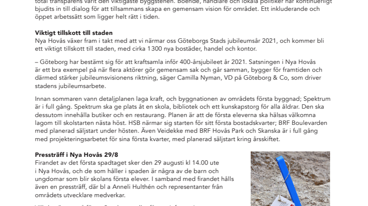 – Göteborg har bestämt sig för att kraftsamla inför 400-årsjubileet år 2021. Satsningen i Nya Hovås är ett bra exempel på när flera aktörer gör gemensam sak och går samman, bygger för framtiden och därmed stärker jubileumsvisionens riktning, säger Camilla Nyman, VD på Göteborg & Co, som driver stadens jubileumsarbete.
