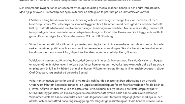 Sammanlagt är det nu nio fastighetsbolag som samarbetar för att utveckla området kallat Nya Hovås. Utöver Skanska, Veidekke, HSB och Next Step Group är dessa Egnahemsbolaget, Familjebostäder, NCC, Sverigehuset och Tornstaden. Målsättningen är att skapa en mittpunkt där fördelarna från den lilla och stora staden förenas med hav och natur. Ett personligt boende med butiker, service, kultur, kontor och gemenskap utanför dörren.