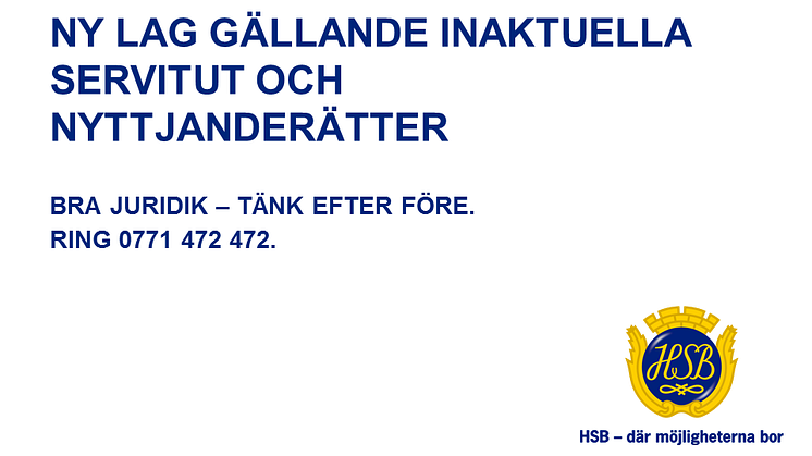 Medlemmar i HSB kan kostnadsfritt kontakta HSBs medlemsrådgivning för generell juridisk rådgivning. Ring 0771 472 472.