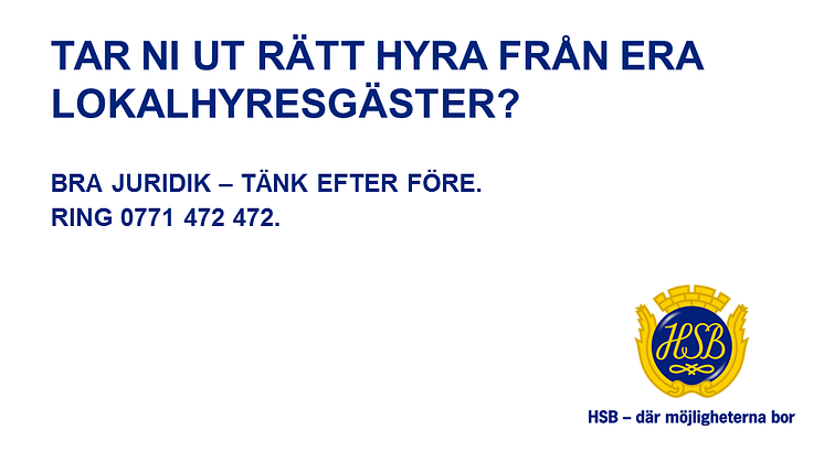 Medlemmar i HSB kan kostnadsfritt kontakta HSBs medlemsrådgivning för generell juridisk rådgivning. Ring 0771 472 472.