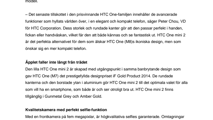 HTC, en global ledare inom innovation och design, presenterade idag HTC One mini 2, som är det senaste tillskottet i den prisvinnande HTC One-familjen. Med en fantastisk 4,5" HD-skärm, HTC Sense™ 6 med HTC Blinkfeed™ och en imponerande kamera med fem megapixlar tar HTC One mini 2 den ikoniska aluminiumdesignen och bäst-i-klassen upplevelsen från HTC One (M8) vidare till dem som önskar en mindre och mer kompakt modell.