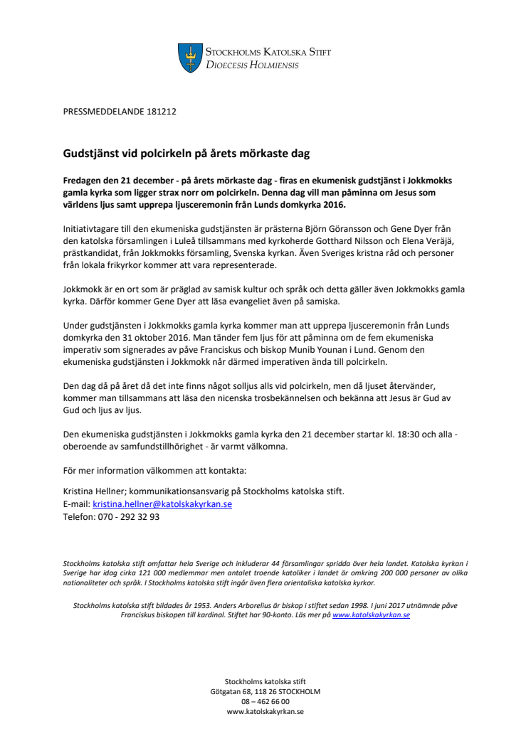 Fredagen den 21 december - på årets mörkaste dag - firas en ekumenisk gudstjänst i Jokkmokks gamla kyrka som ligger strax norr om polcirkeln. Denna dag vill man påminna om Jesus som världens ljus samt upprepa ljusceremonin från Lunds domkyrka 2016.