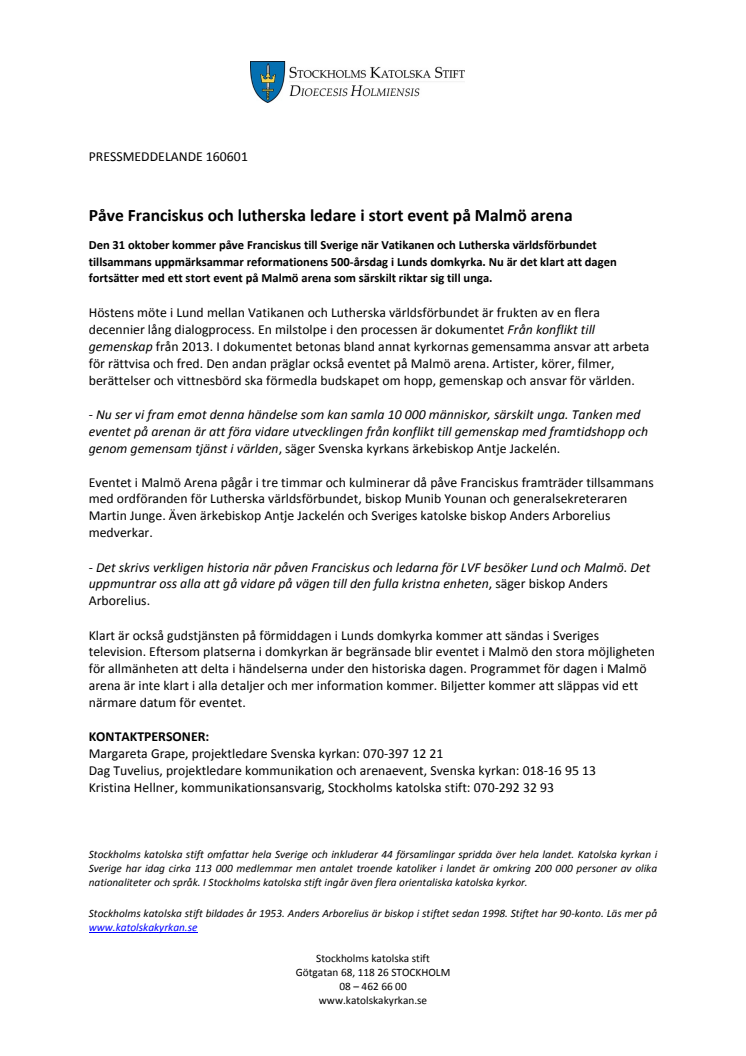 Den 31 oktober kommer påve Franciskus till Sverige när Vatikanen och Lutherska världsförbundet tillsammans uppmärksammar reformationens 500-årsdag i Lunds domkyrka. Nu är det klart att dagen fortsätter med ett stort event på Malmö arena som särskilt riktar sig till unga.