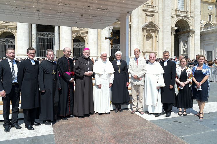 Representanter för Stockholms katolska stift och Svenska kyrkan med påve Franciskus på Petersplatsen i Rom. På bilden syns också ikonmålare Lars Gerdmar.