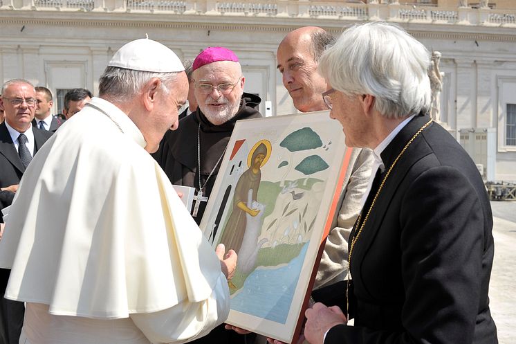 Svenska kyrkans ärkebiskop; Antje Jackelén lämnar över en gåva till påven tillsammans med Stockholms katolska stifts biskop Anders Arborelius. På bilden syns även ikonmålaren Lars Gerdmar.