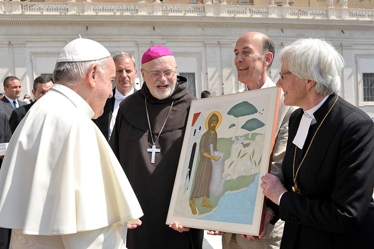 På bilden: påve Franciskus, biskop Anders Arborelius, ikonmålare Lars Gerdmar samt Svenska kyrkans ärkebiskop Antje Jackelén.
