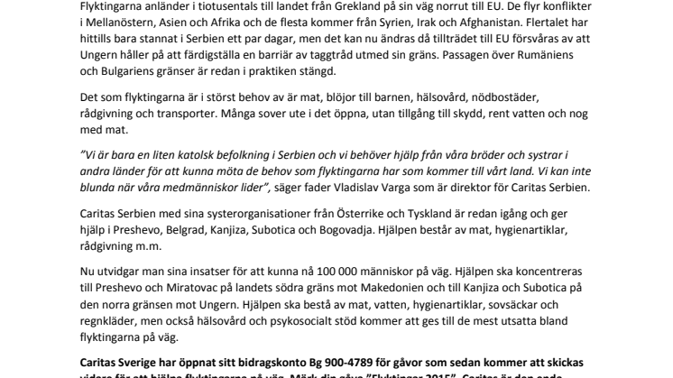Caritas Sverige har öppnat sitt bidragskonto Bg 900-4789 för gåvor som skickas vidare för att hjälpa flyktingarna på väg. Märk din gåva ”Flyktingar 2015”.
