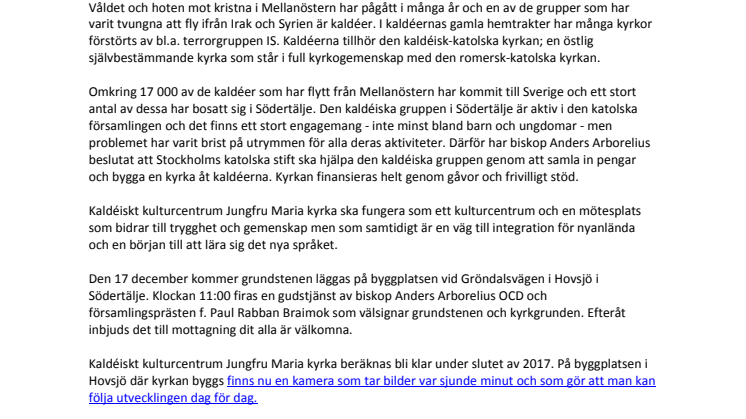 Förföljelsen av kristna i Mellanöstern har tvingat många kaldéer att fly ifrån Irak och Syrien. Ett stort antal kaldéer har kommit till Sverige och bidragit till tillväxten av den orientaliska katolska kyrkan. I Södertälje är gruppen stor och aktiv och behöver utrymme för sina aktiviteter. Därför byggs nu "Kaldeiskt kulturcentrum Jungfru Maria kyrka" åt kaldéerna i området och grundstenen till kyrkan läggs den 17 december.