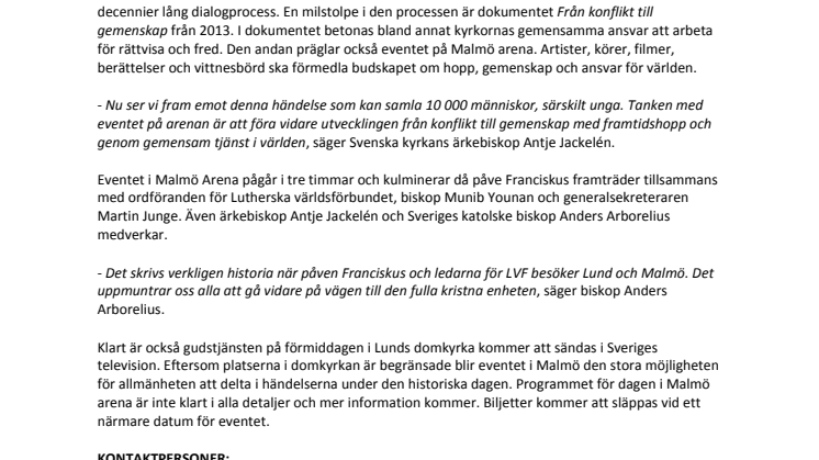 Höstens möte i Lund mellan Vatikanen och Lutherska världsförbundet är frukten av en flera decennier lång dialogprocess. En milstolpe i den processen är dokumentet Från konflikt till gemenskap från 2013. I dokumentet betonas bland annat kyrkornas gemensamma ansvar att arbeta för rättvisa och fred. Den andan präglar också eventet på Malmö arena. Artister, körer, filmer, berättelser och vittnesbörd ska förmedla budskapet om hopp, gemenskap och ansvar för världen.