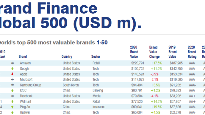 Brand Finance skriver i sin senaste rapport Brand Finance Global 500 2020 ”Det är tydligt att 5G är nästa stora möjlighet i telekomindustrin. 5G har skapat en intensiv konkurrens i telekomvärlden och Huawei når framgång genom att expandera i områden som traditionellt sett har täckts av västerländska leverantörer. Trots att bolaget skapar kontrovers, gör företaget stora framsteg och har nu ett varumärkesvärde på 65,1 miljarder USD. Huawei platsar därmed för första gången på listan över världens 10 mest värdefulla varumärken.”