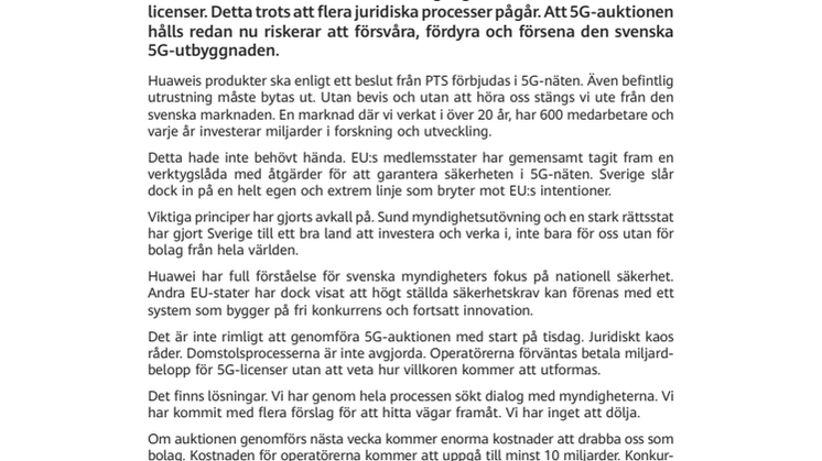 Idag publicerar Huawei ett öppet brev till svenska regeringen genom en helsidesannons i Dagens Industri. ”Regeringen styr riket. Det är inte för sent. Skjut upp auktionen.” uppmanar Huawei-cheferna Kenneth Fredriksen och David Liu regeringen med anledning av att PTS planerar att genomföra auktionen av svenska 5G-licenser trots att flera juridiska processer pågår.