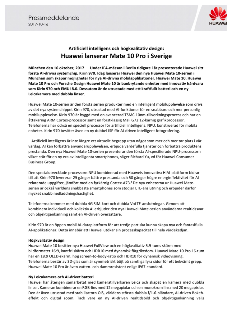 Under IFA-mässan i Berlin tidigare i år presenterade Huawei sitt första AI-drivna systemchip, Kirin 970. Idag lanserar Huawei den nya Huawei Mate 10-serien som skapar möjligheter för nya AI-drivna mobilapplikationer. Huawei Mate 10-serien är banbrytande med innovativ hårdvara som Kirin 970 och EMUI 8.0. Dessutom är produkterna utrustade med ett kraftfullt batteri och en ny Leicakamera.
