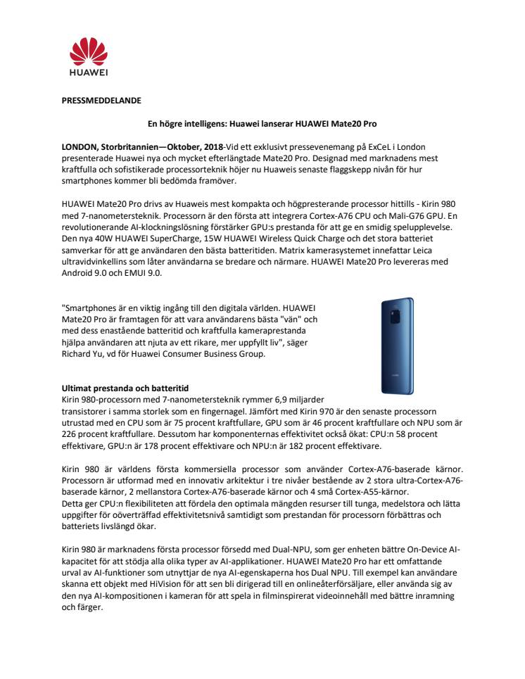 En högre intelligens: Huawei lanserar HUAWEI Mate20 Pro