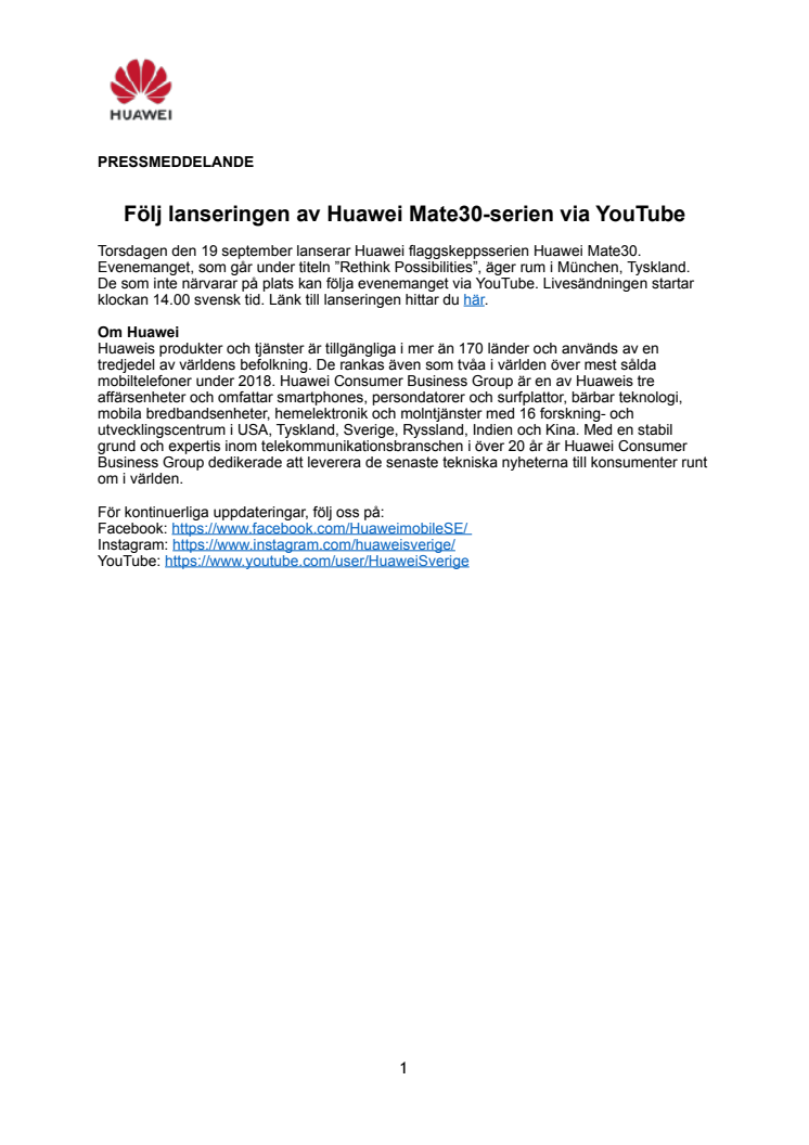 Torsdagen den 19 september lanserar Huawei flaggskeppsserien Huawei Mate30. Evenemanget, som går under titeln ”Rethink Possibilities”, äger rum i München, Tyskland. De som inte närvarar på plats kan följa evenemanget via YouTube. Livesändningen startar klockan 14.00 svensk tid.