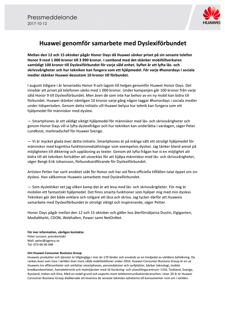 Den 12 och 15 oktober pågår Honor Days då Huawei sänker priset på sin senaste telefon Honor 9 med 1 000 kronor till 3 990 kronor. I samband med det skänker mobiltillverkaren samtidigt 100 kronor till Dyslexiförbundet för varje såld enhet. Syftet är att lyfta läs- och skrivsvårigheter och hur tekniken kan fungera som ett hjälpmedel.