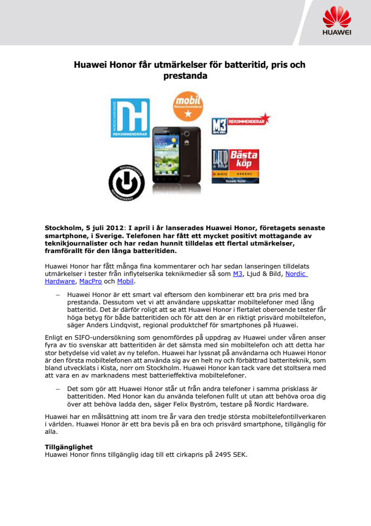 I april i år lanserades Huawei Honor, företagets senaste smartphone, i Sverige. Telefonen har fått ett mycket positivt mottagande av teknikjournalister och har redan hunnit tilldelas ett flertal utmärkelser, framförallt för den långa batteritiden.