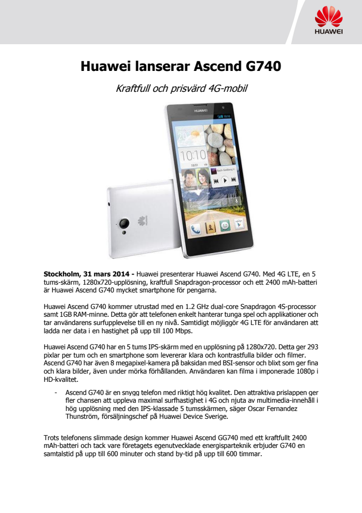 Huawei presenterar Huawei Ascend G740. Med 4G LTE, en 5 tums-skärm, 1280x720-upplösning, kraftfull Snapdragon-processor och ett 2400 mAh-batteri är Huawei Ascend G740 mycket smartphone för pengarna.