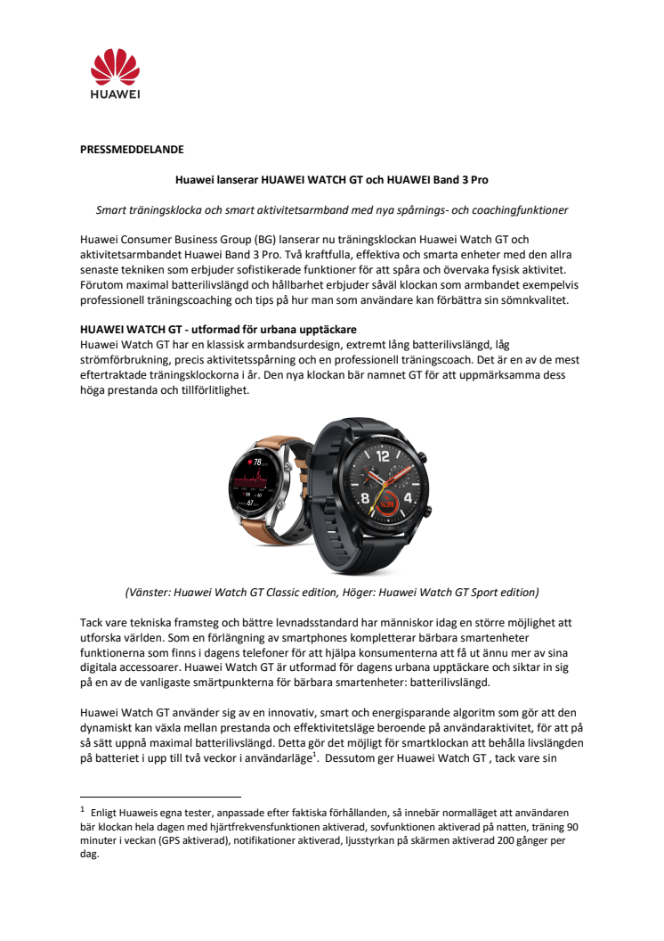 Huawei lanserar HUAWEI WATCH GT och HUAWEI Band 3 Pro