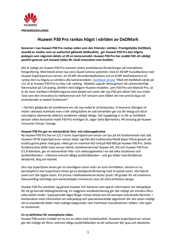 Kameran i nya Huawei P30 Pro rankas redan som den främsta i världen. Prestigefyllda DxOMark, ansedd av medier som en auktoritet gällande bildkvalitet, ger Huawei P30 Pro den högsta poängen som någonsin delats ut till en kameramobil. Huawei P30 Pro har snabbt fått ett väldigt positivt gensvar och Huawei hyllas för såväl innovation som kvalitet.