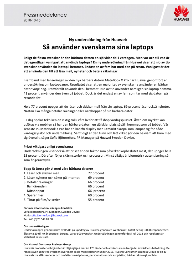Enligt de flesta svenskar är den bärbara datorn en självklar del i vardagen. Men var och till vad är det egentligen vanligast att använda laptops? En ny undersökning från Huawei visar att nio av tio svenskar använder sin laptop i hemmet. Endast en av fem har med den på resan. Vanligast är det att använda den till att läsa mail, nyheter och betala räkningar.