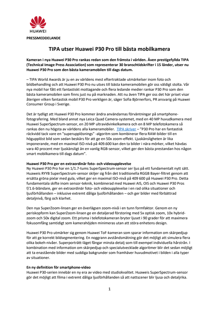 Kameran i nya Huawei P30 Pro rankas redan som den främsta i världen. Även prestigefyllda TIPA (Technical Image Press Association) som representerar 30 branschtidskrifter i 15 länder, utser nu Huawei P30 Pro som den bästa kameramobilen till dags datum.
