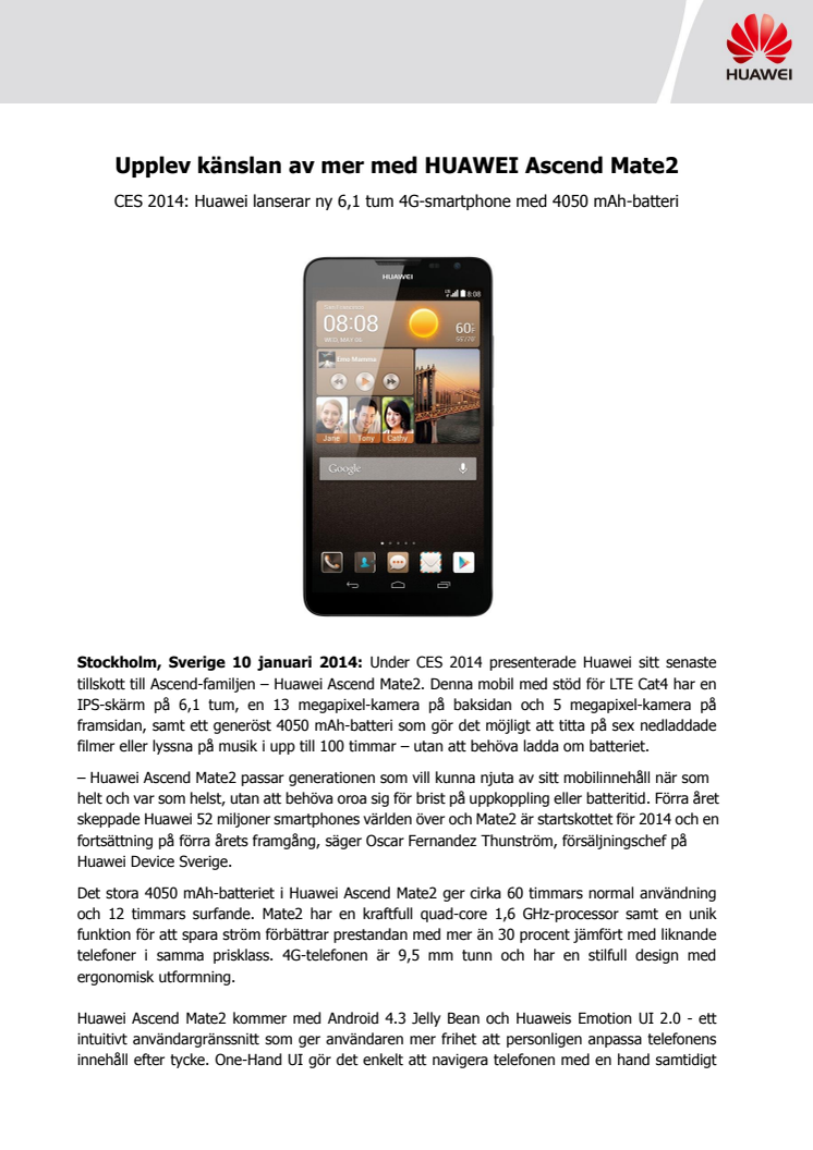 Huawei Ascend Mate2 har stöd för LTE Cat4 har en IPS-skärm på 6,1 tum, en 13 megapixel-kamera på baksidan och 5 megapixel-kamera på framsidan, samt ett generöst 4050 mAh-batteri som gör det möjligt att titta på sex nedladdade filmer eller lyssna på musik i upp till 100 timmar – utan att behöva ladda om batteriet.