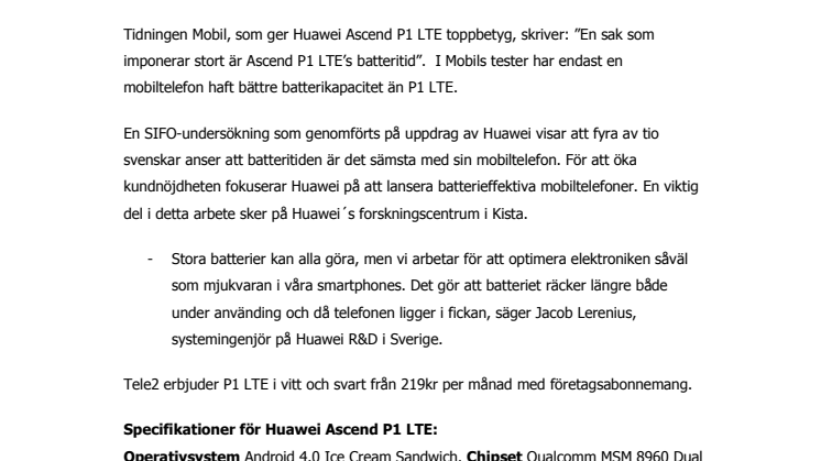 Stockholm den 13 december 2012: Huawei, en ledande global leverantör av informations- och kommunikationsteknik, lanserade i oktober företagets första 4G-mobil på den svenska marknaden. Nu lanseras Ascend P1 LTE i vitt exklusivt med Tele2.