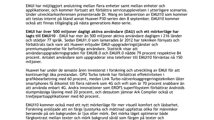 EMUI har möjliggjort anslutning mellan flera enheter samt mellan enheter och applikationer, och kommer fortsatt att förbättra serviceupplevelsen i ytterligare scenarios. Under utvecklarkonferensen presenterade Dr. Wang en betaversion av EMUI10 som kommer att testas internt på bland annat Huawei P30-serien den 8 september. EMUI10 kommer också att finnas tillgänglig på nästa generations Mate-serie.