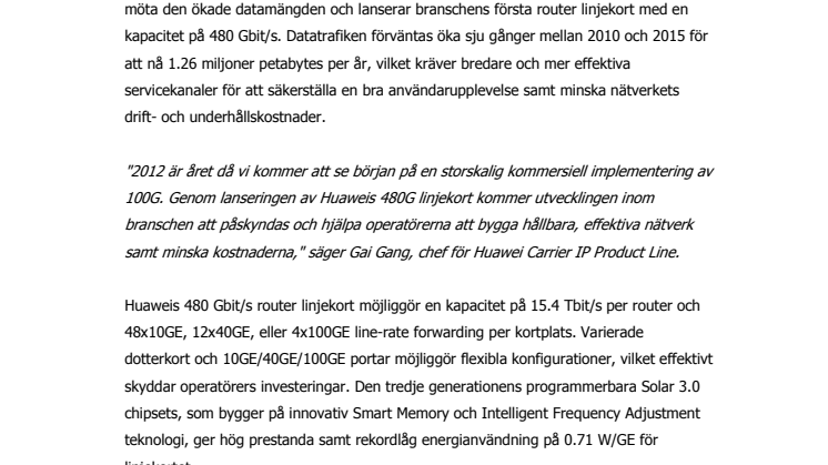 "2012 är året då vi kommer att se början på en storskalig kommersiell implementering av 100G. Genom lanseringen av Huaweis 480G linjekort kommer utvecklingen inom branschen att påskyndas och hjälpa operatörerna att bygga hållbara, effektiva nätverk samt minska kostnaderna," säger Gai Gang, chef för Huawei Carrier IP Product Line.