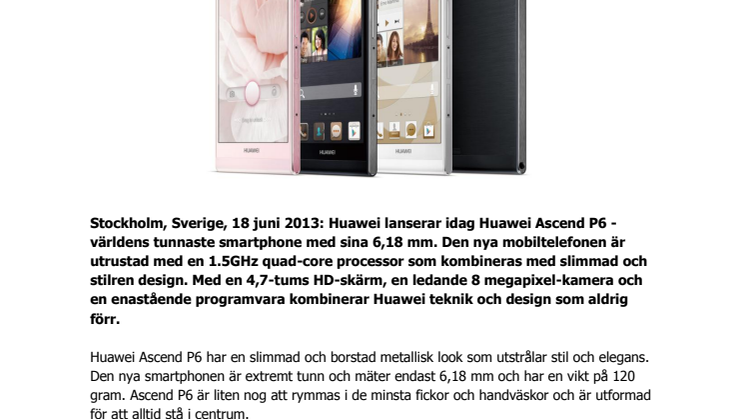 Stockholm, Sverige, 18 juni 2013: Huawei lanserar idag Huawei Ascend P6 - världens tunnaste smartphone med sina 6,18 mm. Den nya mobiltelefonen är utrustad med en 1.5GHz quad-core processor som kombineras med slimmad och stilren design. Med en 4,7-tums HD-skärm, en ledande 8 megapixel-kamera och en enastående programvara kombinerar Huawei teknik och design som aldrig förr.