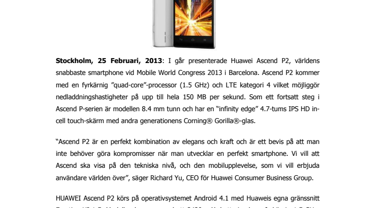 Stockholm, 25 Februari, 2013: I går presenterade Huawei Ascend P2, världens snabbaste smartphone vid Mobile World Congress 2013 i Barcelona. Ascend P2 kommer med en fyrkärnig ”quad-core”-processor (1.5 GHz) och LTE kategori 4 vilket möjliggör nedladdningshastigheter på upp till hela 150 MB per sekund. Som ett fortsatt steg i Ascend P-serien är modellen 8.4 mm tunn och har en “infinity edge” 4.7-tums IPS HD in-cell touch-skärm med andra generationens Corning® Gorilla®-glas.