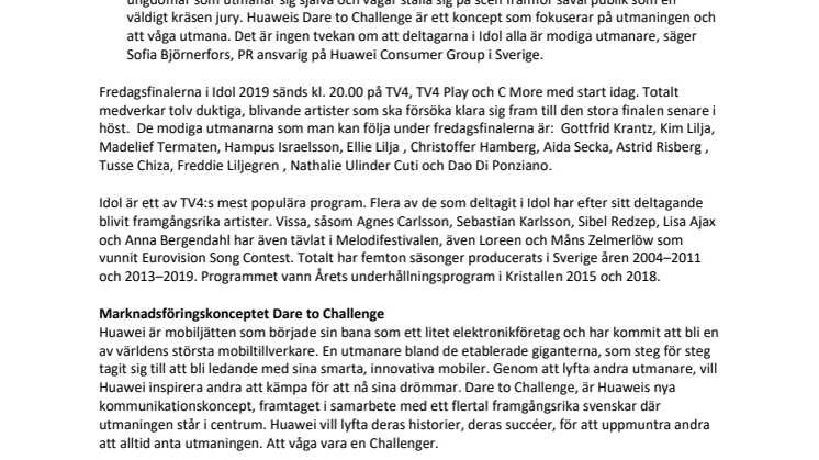 - Vårt marknadsföringskoncept passar Idol-formatet väldigt väl. Vi har en mängd duktiga ungdomar som utmanar sig själva och vågar ställa sig på scen framför såväl publik som en väldigt kräsen jury. Huaweis Dare to Challenge är ett koncept som fokuserar på utmaningen och att våga utmana. Det är ingen tvekan om att deltagarna i Idol alla är modiga utmanare, säger Sofia Björnerfors, PR ansvarig på Huawei Consumer Group i Sverige.