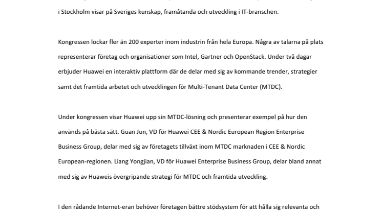 Kongressen lockar fler än 200 experter inom industrin från hela Europa. Några av talarna på plats representerar företag och organisationer som Intel, Gartner och OpenStack. Under två dagar erbjuder Huawei en interaktiv plattform där de delar med sig av kommande trender, strategier samt det framtida arbetet och utvecklingen för Multi-Tenant Data Center (MTDC).