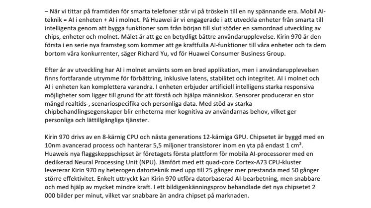 – När vi tittar på framtiden för smarta telefoner står vi på tröskeln till en ny spännande era. Mobil AI-teknik = AI i enheten + AI i molnet. På Huawei är vi engagerade i att utveckla enheter från smarta till intelligenta genom att bygga funktioner som från början till slut stöder en samordnad utveckling av chips, enheter och molnet. Målet är att ge en betydligt bättre användarupplevelse. Kirin 970 är den första i en serie nya framsteg som kommer att ge kraftfulla AI-funktioner till våra enheter och ta dem bortom våra konkurrenter, säger Richard Yu, vd för Huawei Consumer Business Group.