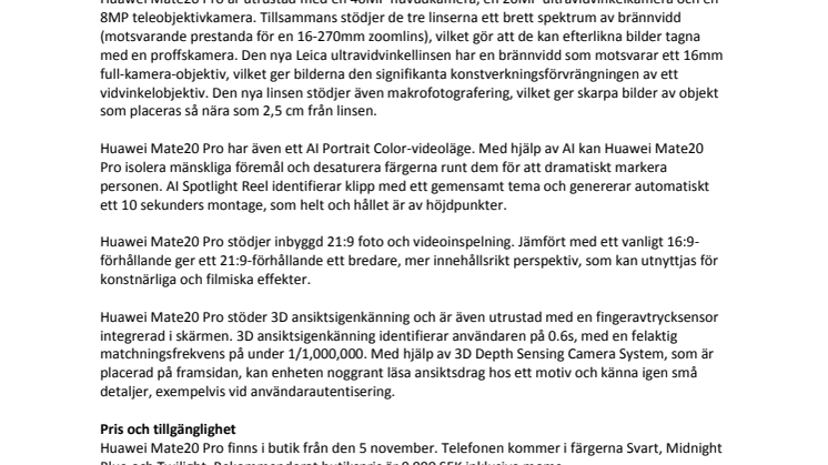 Huawei Mate20 Pro finns i butik från den 5 november. Telefonen kommer i färgerna Svart, Midnight Blue och Twilight. Rekommenderat butikspris är 9 990 SEK inklusive moms.