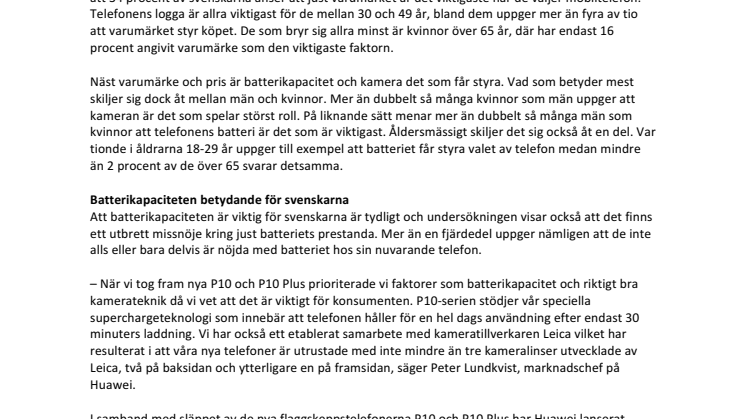 I undersökningen som Kantar Sifo (f.d. TNS Sifo) har genomfört på uppdrag av Huawei framgår det att 34 procent av svenskarna anser att just varumärket är det viktigaste när de väljer mobiltelefon. Telefonens logga är allra viktigast för de mellan 30 och 49 år, bland dem uppger mer än fyra av tio att varumärket styr köpet. De som bryr sig allra minst är kvinnor över 65 år, där har endast 16 procent angivit varumärke som den viktigaste faktorn.