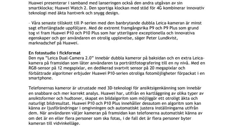 – Våra senaste tillskott till P-serien med den banbrytande dubbla Leica-kameran är minst sagt efterlängtade uppföljare. Med de extremt framgångsrika P9 och P9 Plus som grund tog vi fram Huawei P10 och P10 Plus som har ytterligare exceptionella och innovativa egenskaper och ger användaren en otrolig upplevelse, säger Peter Lundkvist, marknadschef på Huawei.