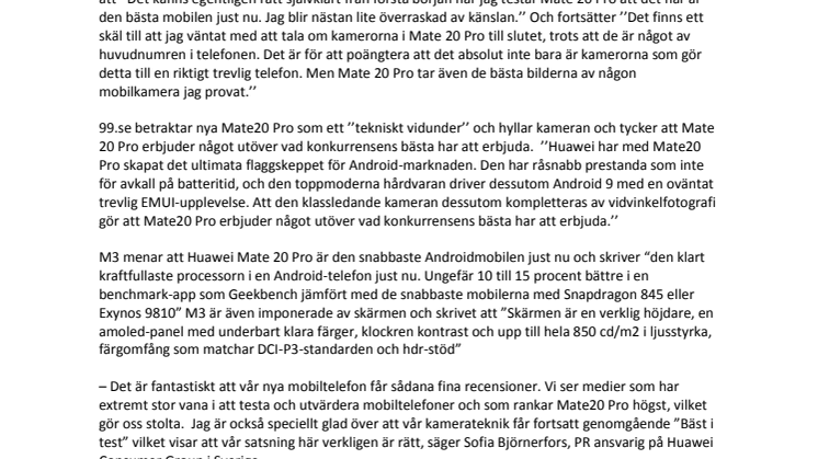 99.se betraktar nya Mate20 Pro som ett ’’tekniskt vidunder’’ och hyllar kameran och tycker att Mate 20 Pro erbjuder något utöver vad konkurrensens bästa har att erbjuda. ’’Huawei har med Mate20 Pro skapat det ultimata flaggskeppet för Android-marknaden. Den har råsnabb prestanda som inte för avkall på batteritid, och den toppmoderna hårdvaran driver dessutom Android 9 med en oväntat trevlig EMUI-upplevelse. Att den klassledande kameran dessutom kompletteras av vidvinkelfotografi gör att Mate20 Pro erbjuder något utöver vad konkurrensens bästa har att erbjuda.’’