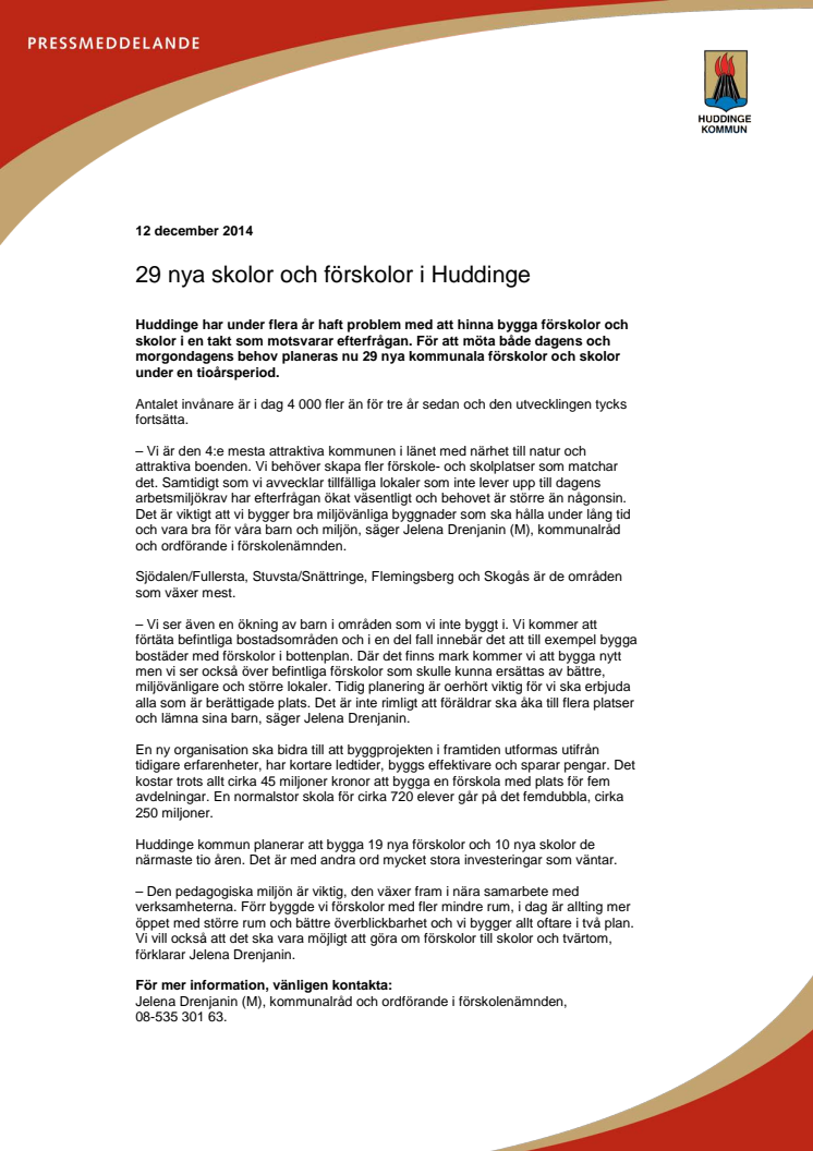 Huddinge har under flera år haft problem med att hinna bygga förskolor och skolor i en takt som motsvarar efterfrågan. För att möta både dagens och morgondagens behov planeras nu 29 nya kommunala förskolor och skolor under en tioårsperiod.