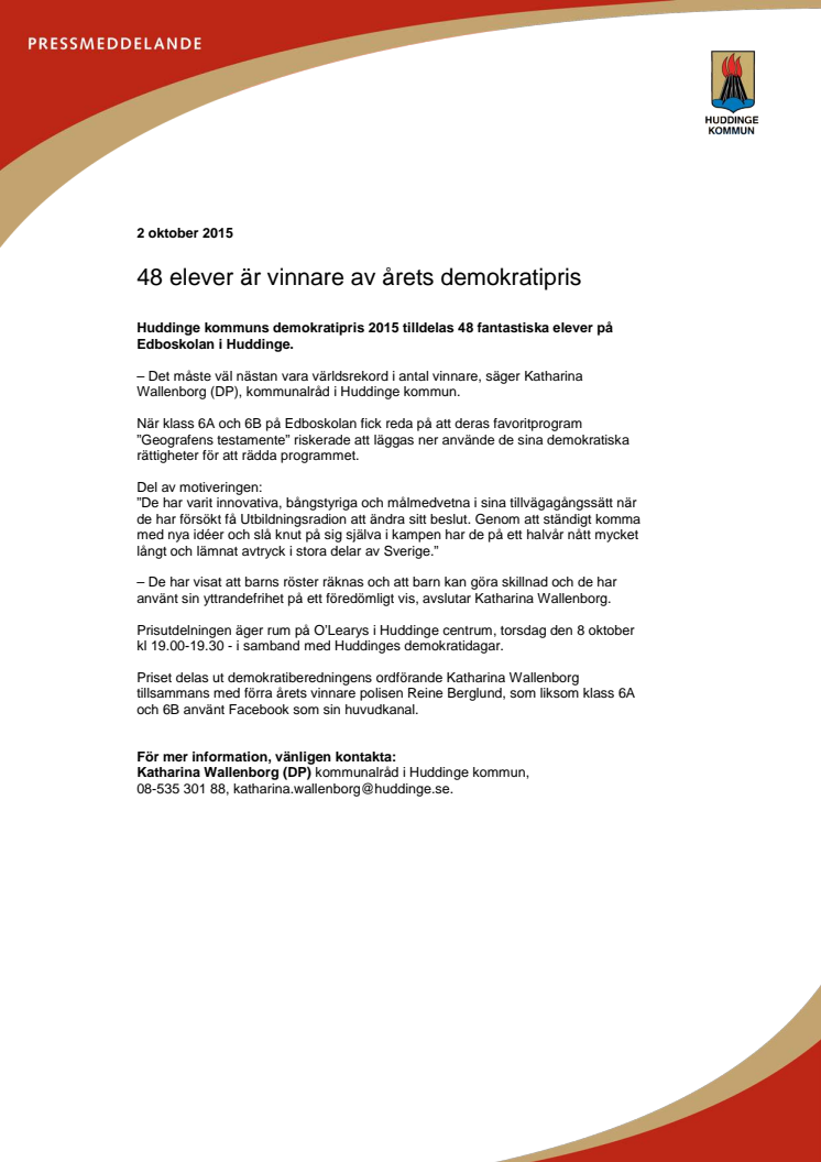Huddinge kommuns demokratipris 2015 tilldelas 48 fantastiska elever på Edboskolan i Huddinge.