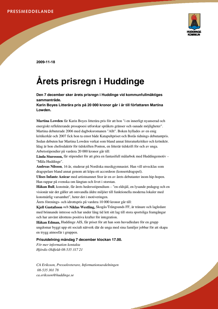 Den 7 december sker årets prisregn i Huddinge vid kommunfullmäktiges sammanträde.