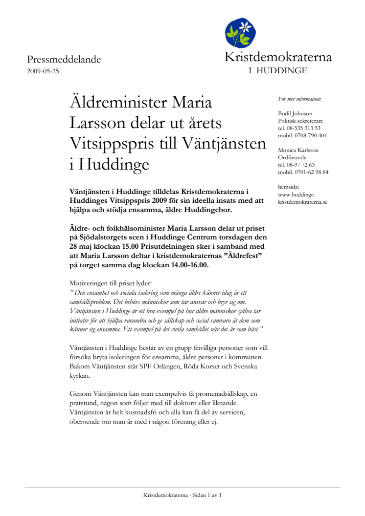 Väntjänsten i Huddinge tilldelas Vitsippspriset 2009 för sin ideella insats med att hjälpa och stödja ensamma, äldre Huddingebor.