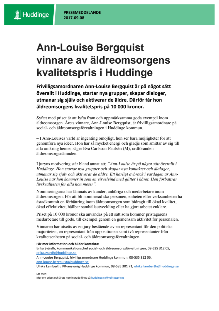 Frivilligsamordnaren Ann-Louise Bergquist är på något sätt överallt i Huddinge, startar nya grupper, skapar dialoger, utmanar sig själv och aktiverar de äldre. Därför får hon äldreomsorgens kvalitetspris på 10 000 kronor.