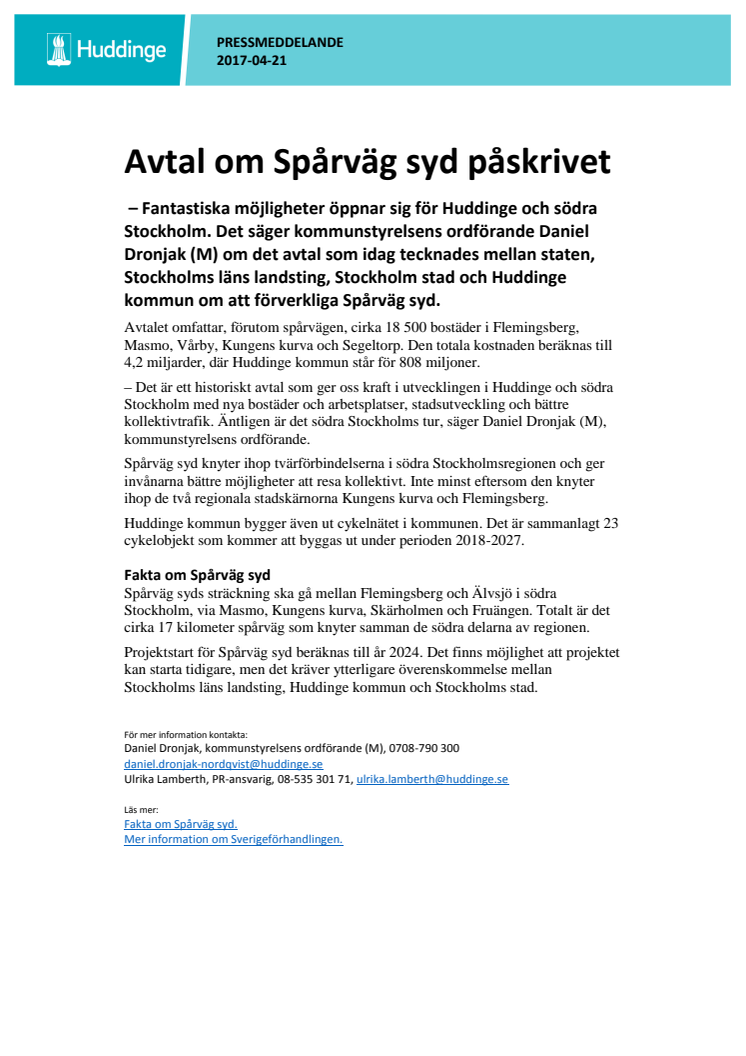 Idag undertecknades avtalet mellan staten, Stockholms läns landsting, Stockholm stad och Huddinge kommun om att förverkliga Spårväg syd.