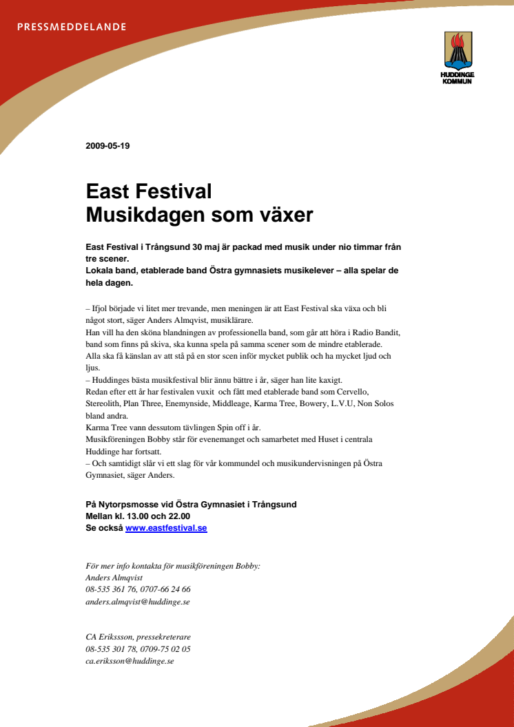East Festival i Trångsund 30 maj är packad med musik under nio timmar från tre scener.
